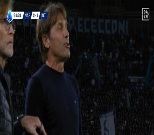 比赛第61分钟,那不勒斯球员在防守中对国米后卫邓弗里斯犯规,后者倒地并做出痛苦表情。然而,距离不远的孔蒂却大声催促邓弗里斯立即起身,继续比赛。