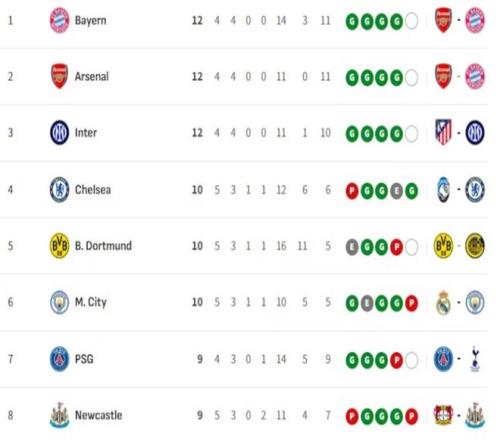 直接晋级16强球队(当前前8名): 拜仁慕尼黑、阿森纳、国际米兰、切尔西、多特蒙德、曼城、巴黎圣日耳曼、纽卡斯尔联
