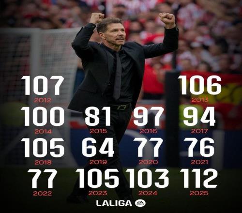马竞2025年进112球,创西蒙尼执教球队14年来自然年进球数纪录