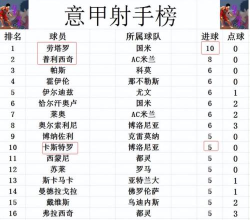 射手榜方面,劳塔罗今天虽然错失了空门,但还是传射建功造2球,他也终于是让意甲本赛季有人进球上双,10球继续领跑。普利西奇8球位列第2,霍伊伦,恰尔汗奥卢,莱奥等人6球并列第3。卡斯特罗打入一球后,追上苏莱,斯卡马卡等人5球刚好挤入前十。