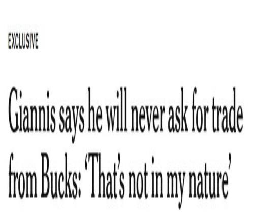 字母哥:没错,绝对不会。我全身心投入,一心扑在篮球事业上,和球队并肩作战,接受当下的一切处境。仅此而已。在这个世界上,我永远不可能放弃我的球队。这不是我的本性。