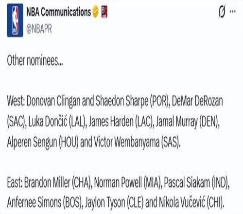 西部:克林根和夏普(开拓者)、德罗赞(国王)、东契奇(湖人)、哈登(快船)、穆雷(掘金)、申京(火箭)、文班亚马(马刺)