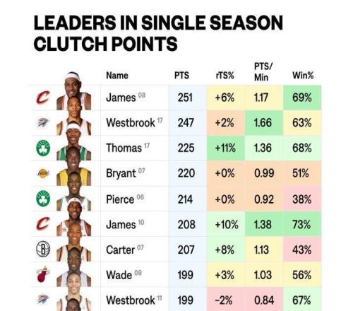 历史单赛季关键时刻得分榜:2008赛季詹姆斯第一!前十没库里! -